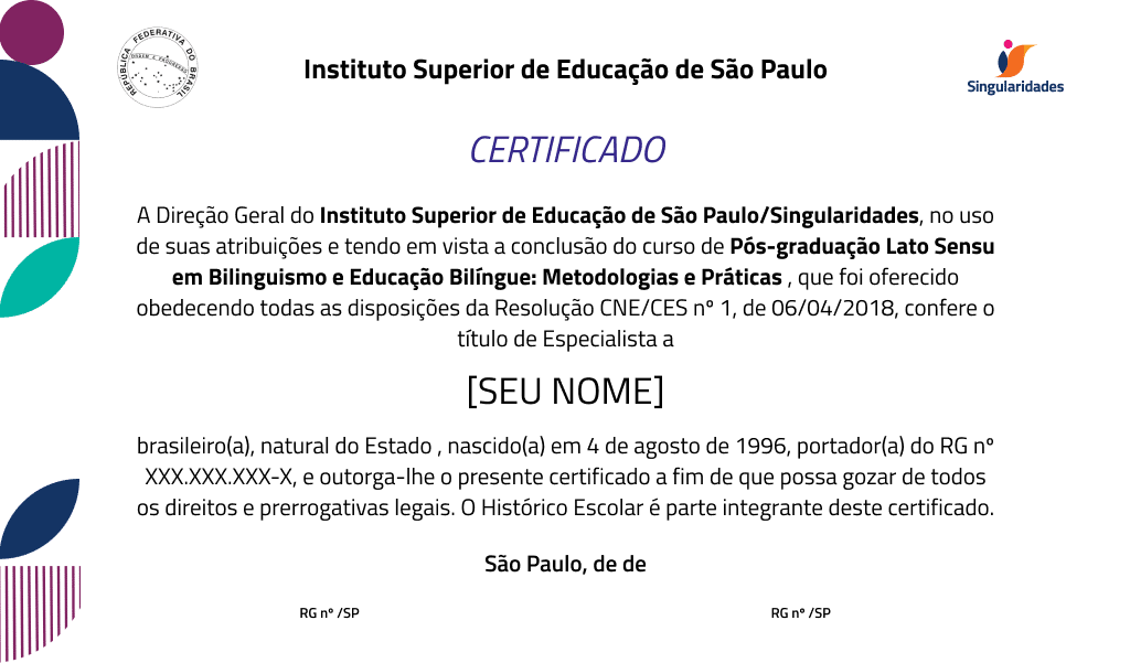 Ao concluir a Pós-Graduação em Docência e Inovação no Ensino Superior no Singularidades, você recebe um certificado reconhecido pelo MEC, que comprova sua qualificação para atuar em contextos educacionais. Uma formação sólida, que fortalece seu currículo e amplia suas possibilidades de atuação com base técnica e credibilidade institucional.